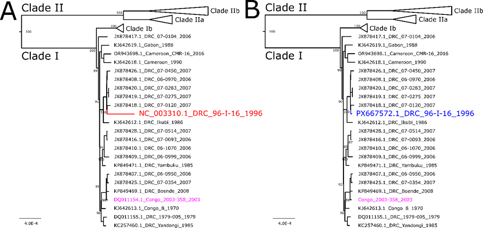 Figure 1. Phylogenetic tree of MPXV strain Zaire-96-I-16 with 22 clade Ia MPXV genomes. A. Original placement of sequence NC_003310.1 is shown in red. B. Updated sequence is shown in blue. Congo 2003-358 sequence is shown in pink to demonstrate no change in phylogenetic placement of re-sequenced isolate. Scale bar is in substitutions per site; support values are shown on nodes as percentages based on 1000 bootstraps. Support values are not shown on terminal nodes for ease of viewing, but all were >74%.